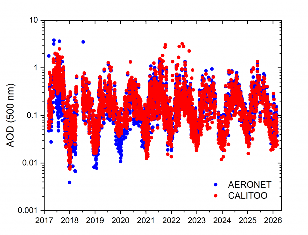 Figure.- AERONET AOD computed at 500 nm from Cimel sun-photometer versus AOD computed from CALITOO hand-held sun-photometer at Tamanrasset. The gap in data in 2018 is due to the replacement of the Calitoo for a newly calibrated one.